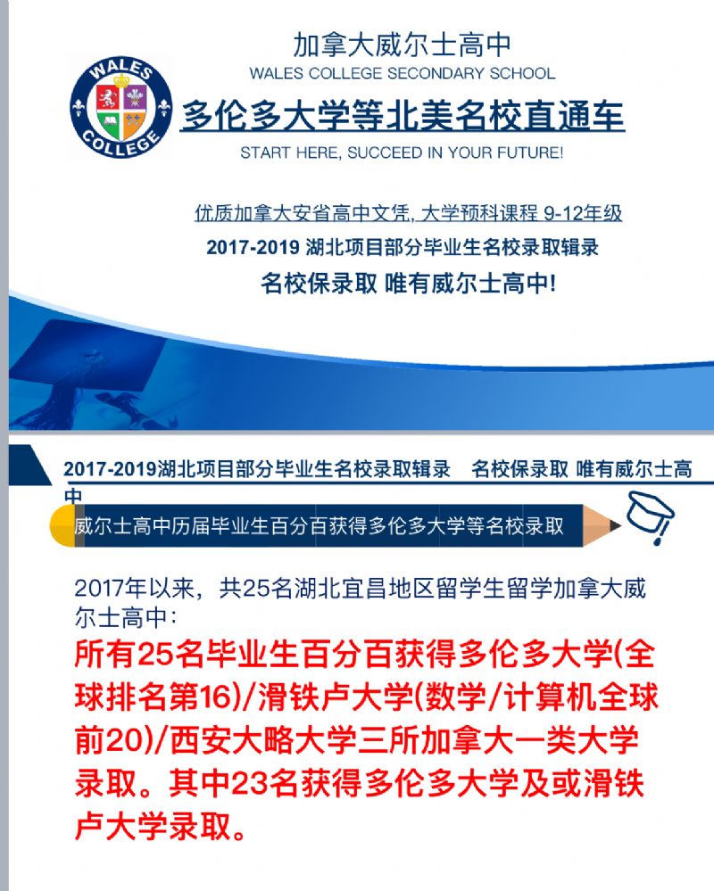 威爾士高中是加拿大多倫多著名本地高中,加拿大安大略省教育部注冊并通過嚴(yán)格審查評估,提供高質(zhì)量安省高中學(xué)分課程;威爾士高中為多倫多唯一SAT(美國高考)官方考試中心/ACT(美國高考)官方考試中心/IELTS雅思官方考試中心,威爾士高中聲譽(yù)卓越,國際認(rèn)可,秉承國際標(biāo)準(zhǔn),構(gòu)建美加名校直升通道,歷屆畢業(yè)生百分百升入美加英澳等世界名校!