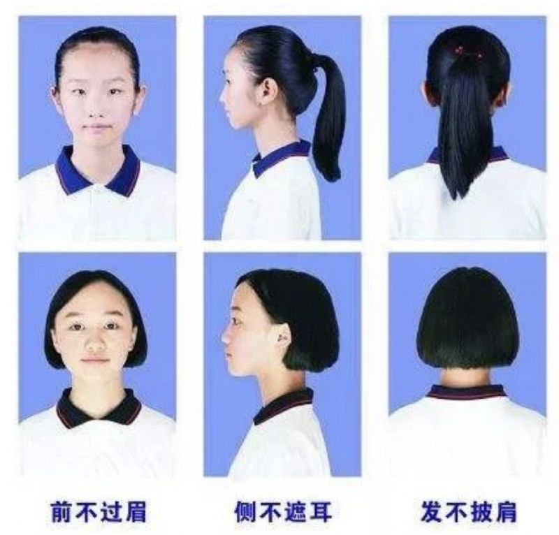 1、儀容儀表符合中學生規(guī)范,不燙發(fā)染發(fā),不化妝,男生不留長發(fā)(發(fā)型要求見上圖),不著奇裝異服;學生在校一律穿校服,不準佩戴飾物。新學期報到時所有學生著校服入校(高一年級、七年級除外),儀容儀表不合格的不辦理報名手續(xù)。