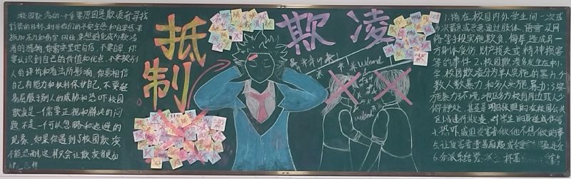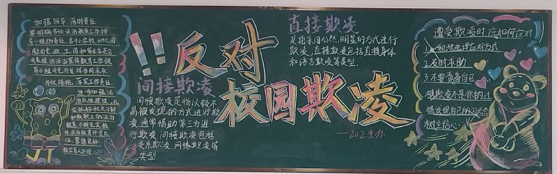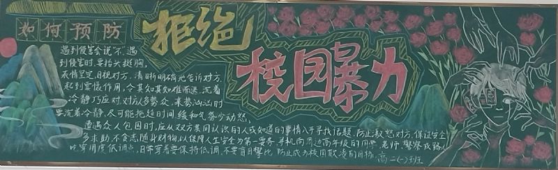 為預防校園暴力事件,構(gòu)建平安和諧校園,增強學生法治知識,提高學生安全防范意識和自我保護能力。10月份我校開展了以“預防校園暴力、杜絕欺凌事件”為主題的板報活動,引領(lǐng)全體學生自覺遵守法律法規(guī)、校規(guī)校紀,理性對待同學之間的矛盾糾紛,克制不良行為。10月底,學生會秘書部在校團委羅書記的帶領(lǐng)下對本次黑板報進行了檢查和評比,201班、202班、204班黑板報榮獲優(yōu)秀等級。