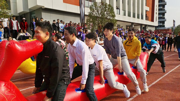 本次體藝節(jié)老師們也參與其中,30米繞桿接力、旱龍舟,有趣的活動項目引得大家大笑不止。尤其是旱龍舟,出現(xiàn)了極富戲劇性的一幕,裁判長誤將“記者”撞倒在地,“記者”順勢坐下拍照,現(xiàn)場掀起出一浪浪的歡呼,卷過龍舟,推著龍舟不斷往前行去,濃濃的師生情融進了山呼般的“加油”聲里。