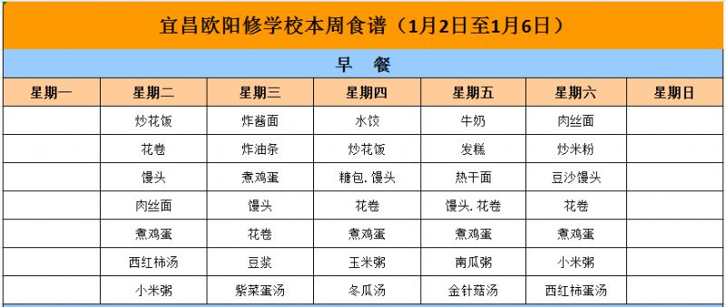 宜昌歐陽(yáng)修學(xué)校本周食譜(1月2日至1月6日)