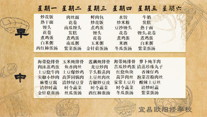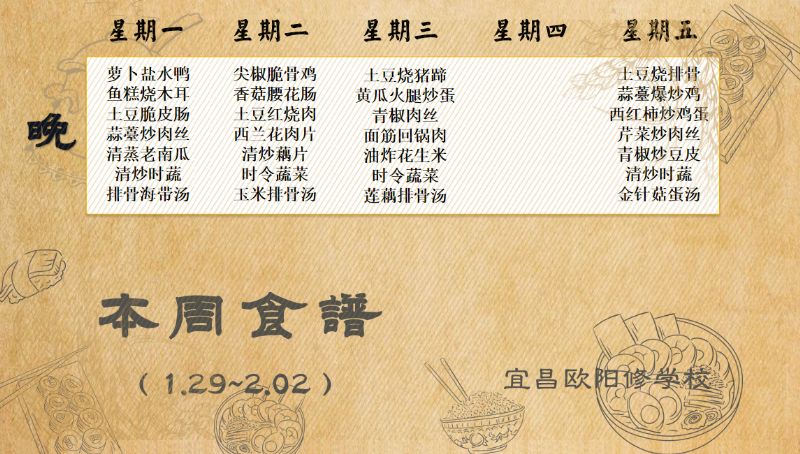 宜昌歐陽修學校每周食譜(1月29日至2月2日)