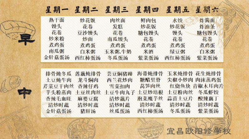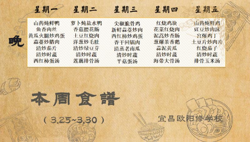 宜昌歐陽修學校每周食譜(3月25日至3月30日)
