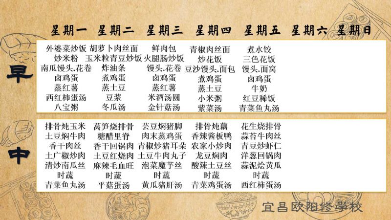 宜昌歐陽修學校每周食譜(10月28日至11月1日)