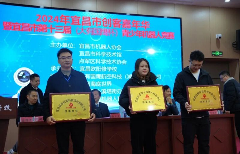 宜昌市科協(xié)副主席張翼、市科協(xié)普及部部長劉亞軍、大有國鷹航空科技(湖北)有限公司總經(jīng)理陳紹文為理事單位——宜昌鯊魚創(chuàng)客科技培訓(xùn)有限公司、宜昌市樂博士機器人科技中心、宜昌優(yōu)趣科技培訓(xùn)有限公司授牌。