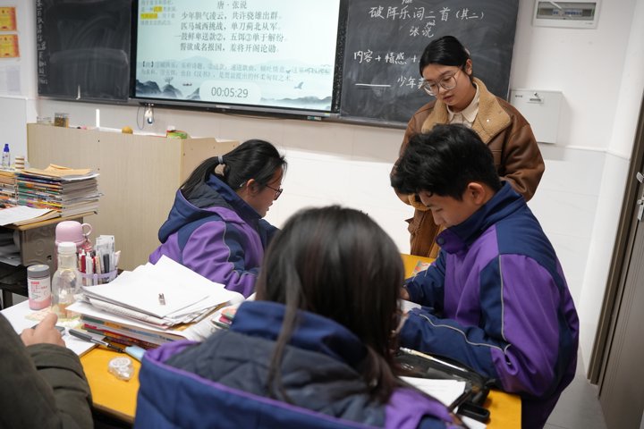 推開206班的教室門,同學們正齊聲朗誦詩歌,秩序井然。譚老師為課堂設置了兩個教學探究題,讓學生通過自主學習、小組交流討論、集中展示等環(huán)節(jié)深入把握詩歌內(nèi)涵,理解少年英雄的形象特點,探討詩歌語言特色。探究重點突出,目標明確。課堂最后讓學生書寫心目中的少年英雄形象,引導學生在生活中用實際行動踐行“少年膽氣凌云,共許驍雄出群”的氣魄與擔當。