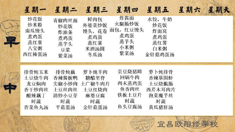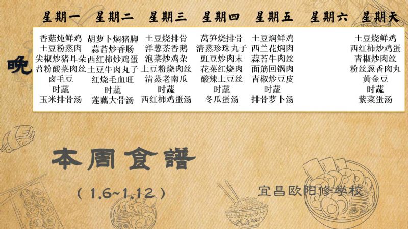 宜昌歐陽(yáng)修學(xué)校每周食譜(1月6日至1月12日)