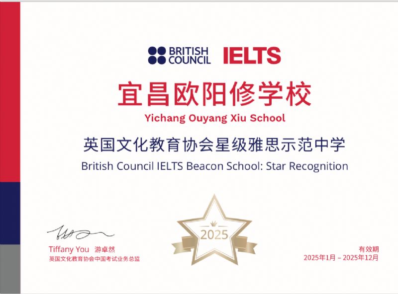 李翠銀主任說:獲此權(quán)威認(rèn)證,標(biāo)志著宜昌歐陽修學(xué)校國際高中的雅思課程體系再次獲得了雅思考試主辦方官方認(rèn)可:①我校國際高中IELTS雅思o(jì)pen辦學(xué)特色獲得認(rèn)可②雅思高效課堂的課程體系、生動(dòng)課堂的教研質(zhì)量、工匠之心師資力量又一次獲得最權(quán)威官方肯定③學(xué)生的聽說讀寫單項(xiàng)及英語綜合能力培養(yǎng)成果顯著。此次獲獎(jiǎng),是繼2024年1月我校被授予“雅思示范中學(xué)”和”雅思教師培訓(xùn)基地“以來再度榮獲BC官方認(rèn)可,是一個(gè)新的里程碑的開始,我校國際高中將一如既往地依托雅思官方資源,為學(xué)生提供高質(zhì)量、高權(quán)威性的備考資源和服務(wù),為學(xué)生圓夢海外名校保駕護(hù)航。一分耕耘一分收獲!數(shù)年的RoadtoIELTS雅思之路探索,宜昌歐陽修學(xué)校國際高中的師生們在IELTS雅思課程教學(xué)及考試方面投入了大量精力,也取得了優(yōu)異成績,教學(xué)教研效果以及專業(yè)師資團(tuán)隊(duì)的敬業(yè)精神能再次獲得BC英國文化教育協(xié)會(huì)的認(rèn)可,被授予年度星級(jí)雅思示范中學(xué)(宜昌市唯一、湖北省僅3所學(xué)校),是值得驕傲和自豪的。因?yàn)椤靶羌?jí)雅思示范中學(xué)”評選條件十分嚴(yán)格,一是雅思課程的教學(xué)質(zhì)量和考生數(shù)量及成績均達(dá)到英國文化教育協(xié)會(huì)的規(guī)定標(biāo)準(zhǔn),二是在評選過程中,英國文化教育協(xié)會(huì)還會(huì)專門組織團(tuán)隊(duì)深入各候選學(xué)校,全面評估雅思課程的實(shí)施狀況及學(xué)生綜合表現(xiàn)。