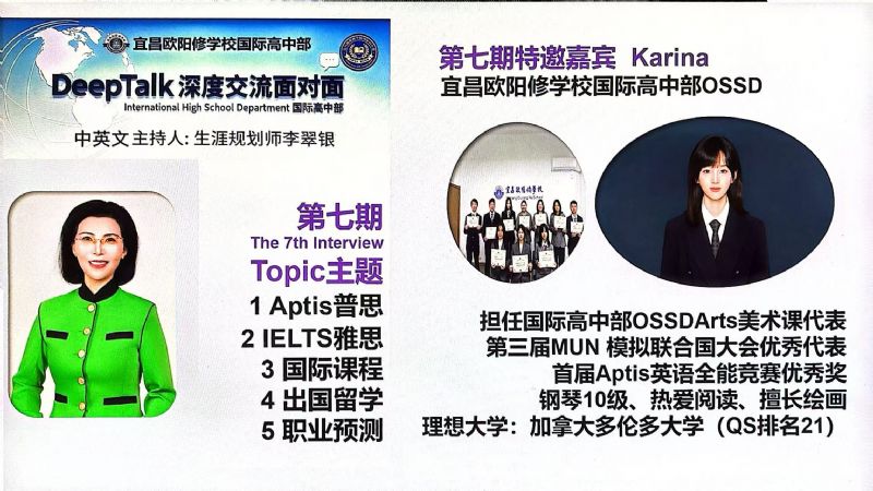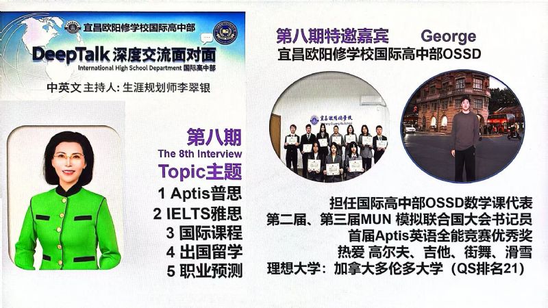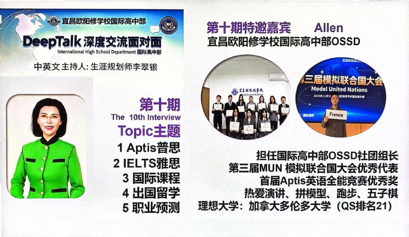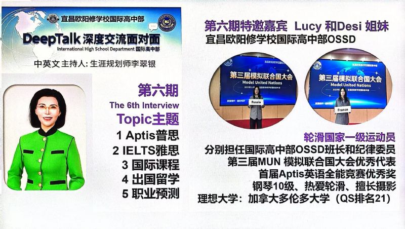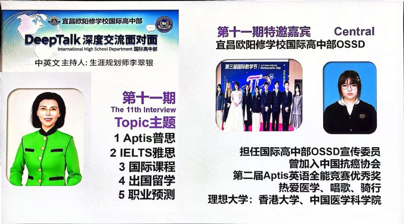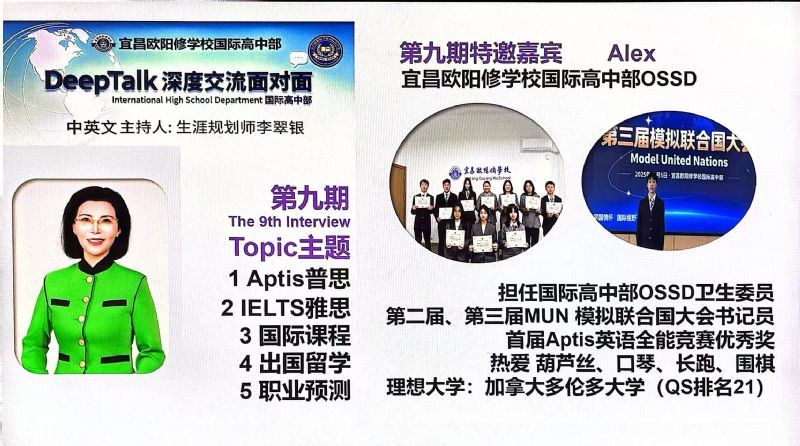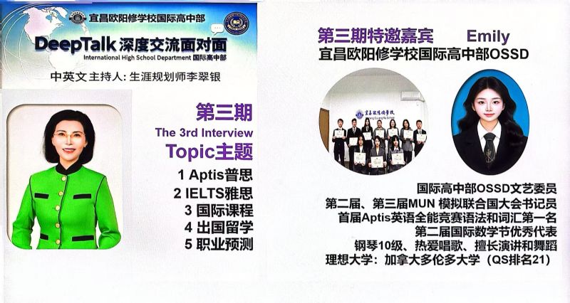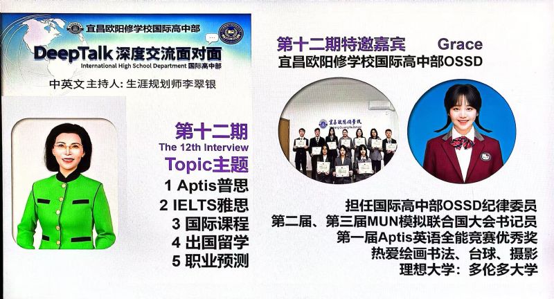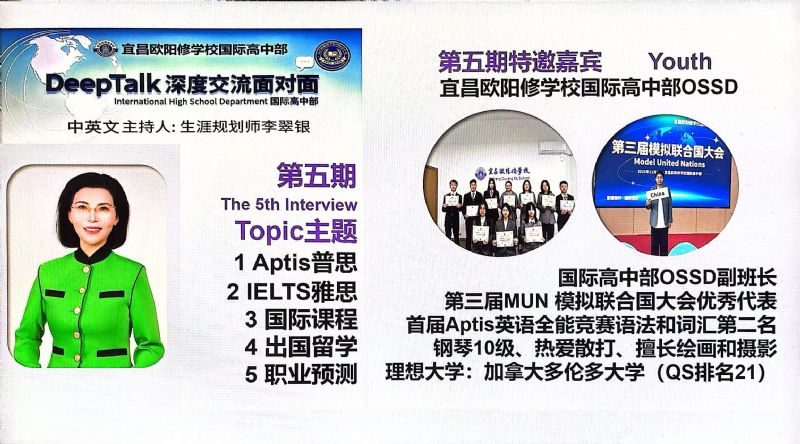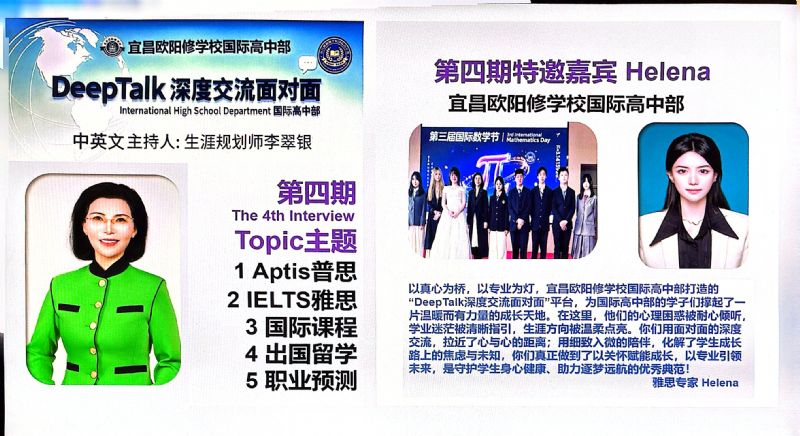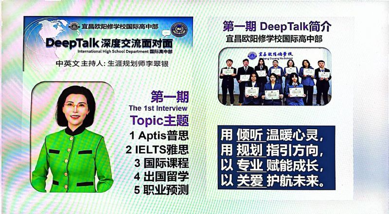 為什么要搭建DeepTalk這個平臺? 因為國際高中部的學(xué)生面臨著國際標(biāo)化考試、出國留學(xué)、文化融入以及自我認(rèn)知的多重挑戰(zhàn),為了切中家長和學(xué)生的剛需,確保學(xué)生身心健康地成長,宜昌歐陽修學(xué)校國際高中部,經(jīng)過總結(jié)多年的教育教學(xué)經(jīng)驗,決定于2023年9月正式為學(xué)生搭建一個集心理支持、學(xué)業(yè)規(guī)劃和生涯指導(dǎo)于一體的平臺:DeepTalk深度交流面對面。